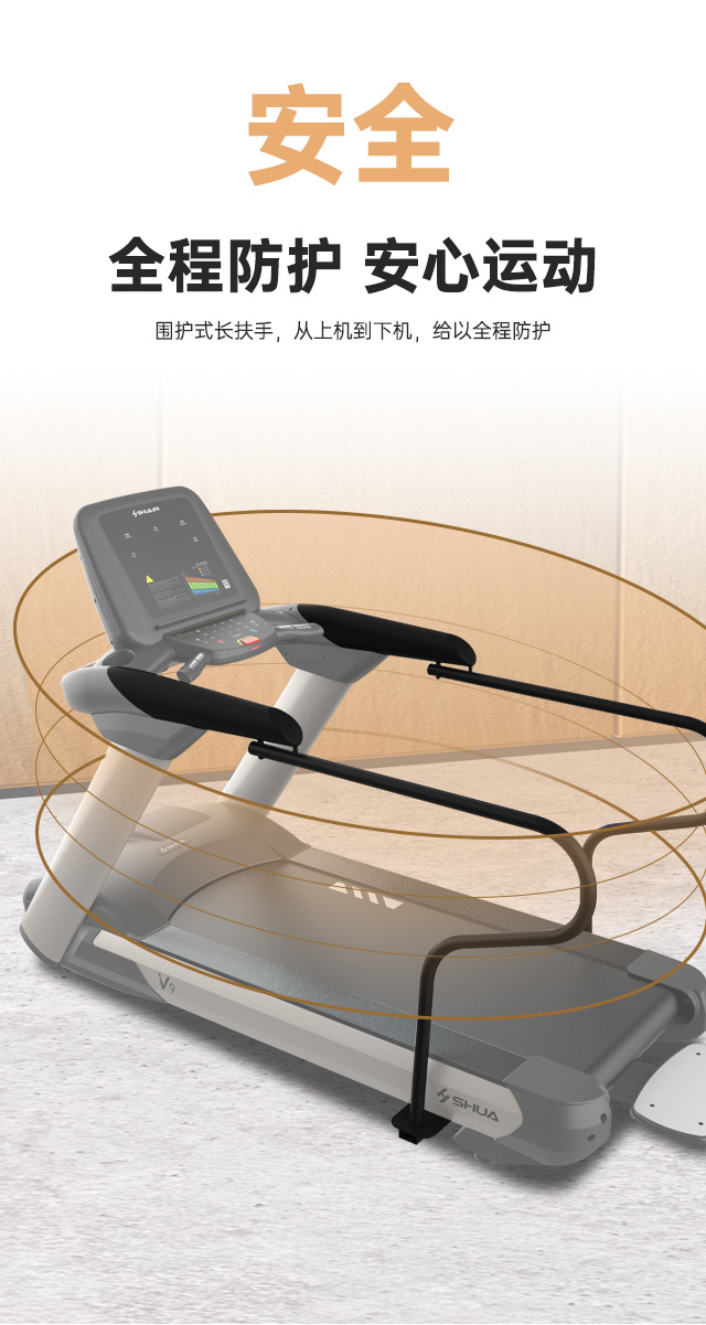 • 产品简介:舒华V9尊享版跑步机SH-T899设有辅助上下机踏板的驱动踏板,控制速度在-5至10km/h内可调,坡度也可在-3至15%内可调,跑台尺寸是580×1570mm,持续马力是AC 3.0HP。