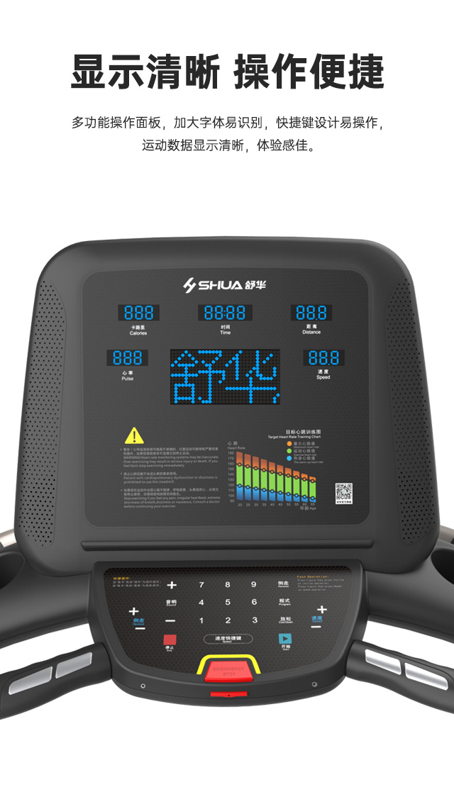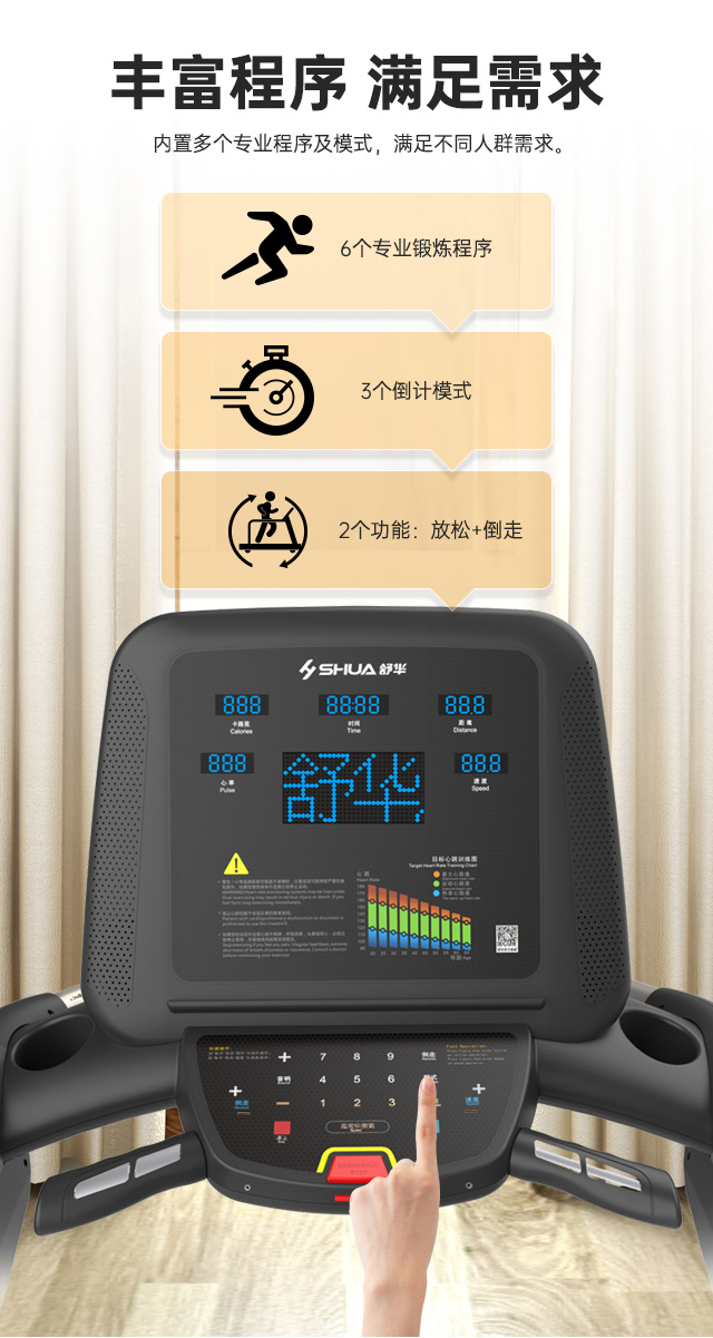 舒华V9尊享版跑步机SH-T899设有辅助上下机踏板的驱动踏板,控制速度在-5至10km/h内可调,坡度也可在-3至15%内可调,跑台尺寸是580×1570mm,持续马力是AC 3.0HP。